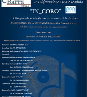 Si terrà oggi presso l’Auditorium del Plesso Posidonia la manifestazione conclusiva del modulo In_Coro. Il linguaggio musicale come strumento di inclusione. L’evento che sarà visibile anche via streaming attraverso il sito dell’Istituto Comprensivo Gennaro Barra vedrà alla direzione del coro la professoressa Marina del Sorbo. Mentre si esibiranno gli allievi Giulia, Francesco, Catia, Giovanna, Ludovica, Federico, Chiara, Sara, Luca, Swami, Ilary, Paola, Francesca, Gaia, Matteo. La giornata inizierà alle ore 16, con i saluti della dirigente scolastica Renata Florimonte, a seguire ci saranno gli interventi dell’assessore alle politiche sociali Paola De Roberto, del parroco della Chiesa di Santa Croce don Antonio Romano Junior, del presidente dell’Unione Italiana Ciechi ed ipovedenti della sezione di Salerno dottor Raffaele Rosa, di Valentina Marano della Cooperativa Poldo, di Luca Goffredo della cooperativa sociale Giovamente, di Alessandra Forgione della Cooperativa Sociale Il deltaplano. A seguire alle 16,45 l’esibizione del coro e alle 17:20 ci sarà l’attività laboratoriale di italiano e inclusione dal tema “La difficile scelta di Paride”.