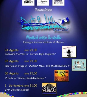 Le Associazioni Culturali SARANNO VIETRESI, L’ETOILE e EMOTION ON STAGE presentano una rassegna dedicata al Musical nella splendida cornice della Villa Comunale di Vietri Sul Mare. Quattro i titoli in programma che si alterneranno dal 24 agosto al 1 settembre. Dà il via alla rassegna “Le voci degli Scugnizzi” dei Saranno Vietresi, musical verace sulle vite dei ragazzi di strada che promette di divertire e far riflettere su un tema di scottante attualità: l’appuntamento è per il 24 agosto alle ore 21.00. Il 28 agosto si balla al ritmo degli Abba con gli Emotion On Stage e il musical “Mamma Mia che Matrimonio!”: una figlia, tre probabili papà e tante risate. Il 30 agosto è invece dedicata agli spettatori più giovani: “Simba il Re della Savana” è una favola musicale che commuoverà il pubblico. Gran Finale il 1 settembre con il “Gran Galà del Musical”: le tre associazioni porteranno in scena brani tratti dai più celebri musical e commedie musicali. La rassegna è stata organizzata dai presidenti delle associazioni Guido Mastroianni, Alessia Scermino e Carla Russo in collaborazione con Ciro Marraffa, Roberta D’Alessio e Luigia Pappalardo. L’intento della rassegna è quello di intrattenere e divertire, ma soprattutto di avvicinare il grande pubblico al Musical, genere complesso in quanto unisce canto, recitazione e danza. Numerosissimi gli artisti impegnati nella rassegna, si rimanda alla pagina facebook per i dettagli delle serate.
