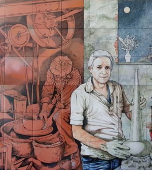 “Il pannello innanzitutto è formato da piastrelle 30×30 ed è alto 1metro ed ottanta ed è largo 2 metri e dieci. È diviso in due parti: una dipinta direttamente sulla terra cotta e l’altra dipinta sullo smalto. La parte in terracotta propone una descrizione storica ed artigianale della ceramica di qualche anno fa, la parte moderna, invece, smaltata in bianco, riproduce il ritratto di Carmine Carrera mentre sta tirando uno dei suoi vasi. Poi, sono presenti delle iscrizioni. Il pannello non solo è dedicato a Carmine Carrera, ma anche alla città di Vietri. Sono oramai più di 30 anni che lavoro qui ed ho sempre avuto un ottimo rapporto con la città ed il territorio, quindi non si poteva non fare una dedica alla Città.”.