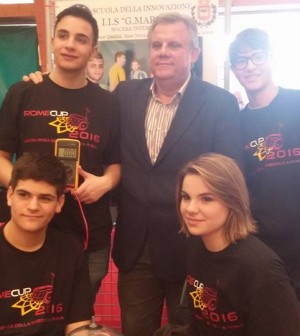 NOCERA INFERIORE. Pio Francesco Armenante, Giusy Longobardo, Pasquale Nocera e Daniele Viscardi si sono classificati al terzo posto nella finale di robotica che si è svolta venerdì scorso in Campidoglio. Con loro è salito sugli allori l'IIS Marconi di Nocera Inferiore dal momento che la realizzazione del Robot esploratore ha visto lavorare assieme gli studenti di due indirizzi, sia quello di Elettronica ed Elettrotecnica, sia quello di Informatica e Telecomunicazioni. Al fianco del team che ha tenuto alto il nome dell'Istituto nocerino ci sono stati, non a caso, il Dirigente Scolastico Alessandro Ferraiuolo e il Docente accompagnatore Giuseppe Amato, che ne hanno condiviso i sacrifici e l'entusiasmo. Come è noto, in seno alla "Romecup 2016" hanno partecipato alla sezione del "Robot esploratore" gli studenti di 56 scuole provenienti da tutta Italia che si sono confrontati tra loro al "Palalevante" di Roma il 16 e il 17 marzo Il robottino nocerino ha cambiato nome, passando dall' ostico "Igmrob" al più familiare “Ugo” ma ha confermato le sue ottime qualità, muovendosi con disinvoltura lungo il percorso assegnato, individuando le sorgenti luminose disseminate su di esso.