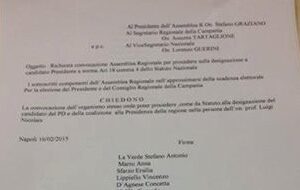 C’è la richiesta di convocazione dell’assemblea regionale del Partito democratico. L’accordo sarebbe stato raggiunto sulla candidatura di Gino Nicolais. Un colpo di scena a pochi giorni dalle primarie. L’assemblea dovrebbe essere convocata per sabato. Sul nome di Nicolais è arrivato anche il via libera di Guglielmo Vaccaro mentre mancherebbe ancora la firma di Simone Valiante. Il segretario Tartaglione smentisce la notizia mentre Di Lello pubblica il documento in cui ci sono le firme per la richiesta (foto)