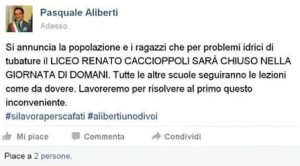 Buontemponi, probabilmente studenti, hanno pensato bene di far girare un post del sindaco Pasquale Aliberti in cui si annuncia la chiusura del liceo Caccioppoli. Evidente il linguaggio da studente. Il post è stato prontamente smentito dal primo cittadino