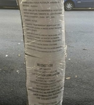 Manca solo la “taglia” in dollari e la scritta “wanted” per essere di fronte ad una ricerca in perfetto stile american cowboy con lo sceriffo con le stellette pronto ad intervenire. Una cittadina salernitana (Annamaria) ha affisso un manifesto-volantino attraverso il quale invita a diffidare di tale Olga Ludmilla Kyrilova “definita serva russa” e rivolgendo una serie di epititi alla stessa. “E’ una poco di buono, una prostituta. Io la maledico 24 ore su 24. Vi consiglio di non dare lavoro a questa donna. Questa signora avrà a breve problemi con la giustizia. Io sono una testa dura e andrò avanti fin quando non sarà fatta giustizia”. La donna riferisce la badante russa ha lavorato ad Antessano e Baronissi e inserisce anche dei riferimenti telefonici di un’amica affermando che Olga Kyrilova è una ruba mariti. “E’ un’imbrogliona e truffatrice e io lo dimostrerò”. La donna si dice disposta a dare una ricompensa a chiunque dia notizie sulla cittadina dell’est. Non resta che prendere appunti.