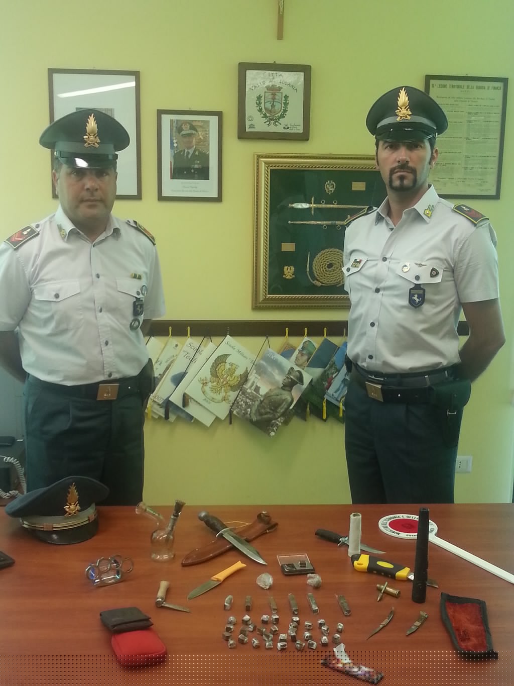 Vallo della Lucania. Ancora un colpo ben assestato inferto dalle forze dell’ordine al fenomeno legato allo spaccio di sostanze stupefacenti. Operazione messa a segno dai militari della Guardia di Finanza della Tenenza di Vallo della Lucania. Ad essere ammanettato un cittadino di origini ucraine sorpreso in possesso di un discreti quantitativo di hascisc. Il giovane viene intercettato da una pattuglia. Quest’ultimo alla vista delle divise, temendo di essere scoperto, fa scivolare dalle tasche un involucro contenente due grammi di hascisc. Una mossa che non passa inosservata alo sguardo attento dei finanzieri che recupero la merce e fermano il ragazzo. A quel punto si procede con altri accertamenti viene perquisita la sua vettura parcheggiata poco distante. Difatti, ben nascosti nell’intercapedine del cruscotto, venivano fuori altri 12 grammi. La perquisizione ha interessato, successivamente, anche l’abitazione dell’ucraino. E’ proprio tra le mura dell’abitazione veniva rinvenuto il grosso del prodotto costituito da 152 grammi di hascisc, 50 semi di canapa, qualche grammo di marijuana il tutto già confezionato in dosi. Trovati anche un bilancino, due pugnali, cinque coltelli usati per tagliare “la roba”, un tirapugni ed altre suppellettili. A quel punto sono scattate le manette per il giovane che è stato rinchiuso nel carcere di Vallo della Lucania.