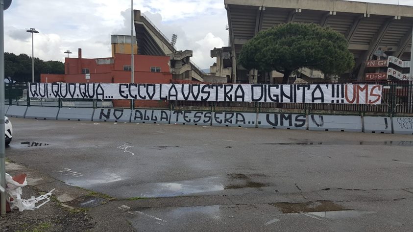 Il gruppo ultras UMS (Ultras Movement Salerno) ha pubblicato sulla propria pagina facebook la foto dello striscione affisso questa mattina dinanzi allo stadio Arechi nei pressi della Curva Sud Siberiano. Sullo striscione si legge: «Qui, Quo, Qua… Ecco la vostra dignità» firmato UMS.
