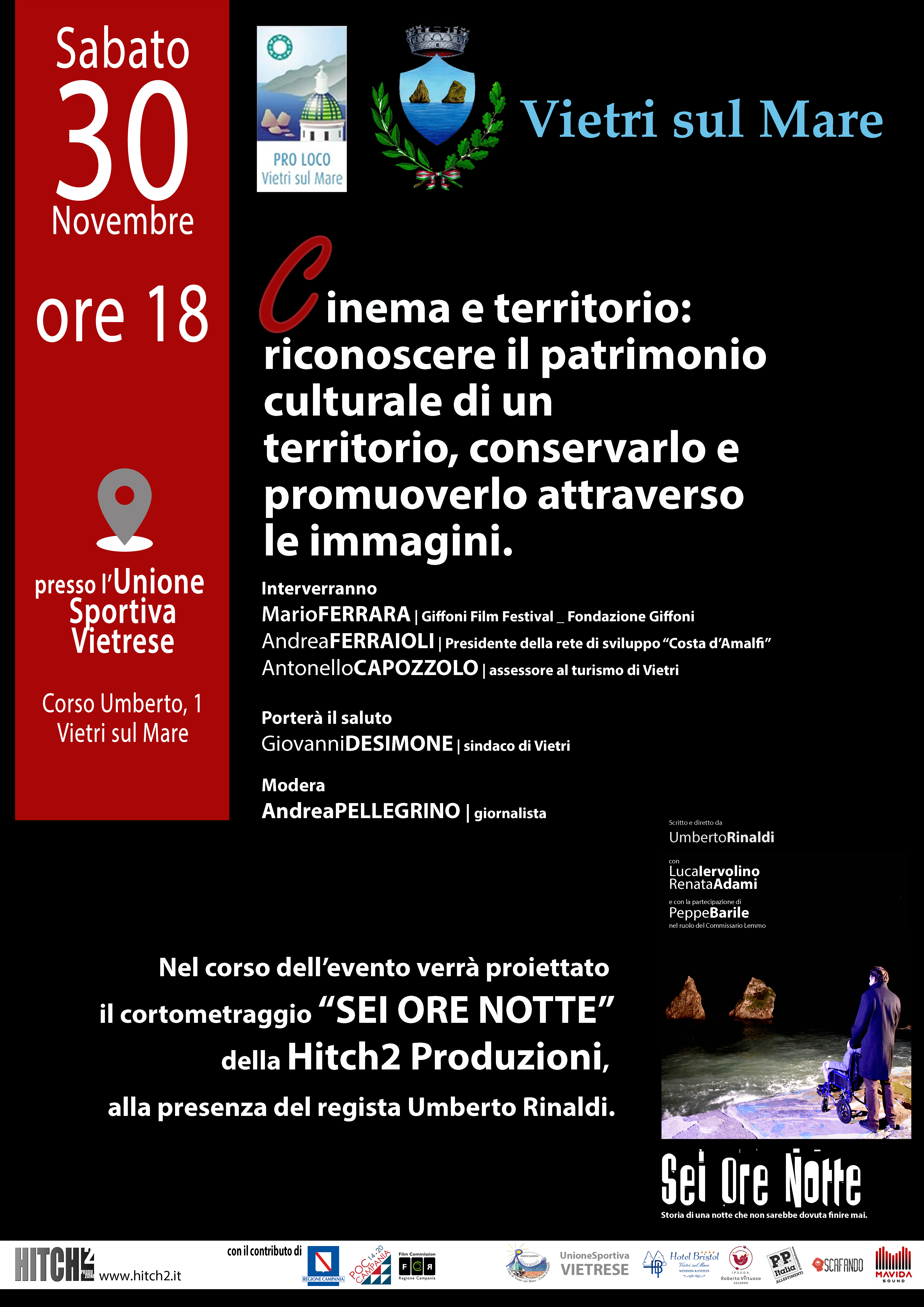 Nel corso dell’evento, inoltre, verrà proiettato il cortometraggio “Sei ore notte” della Hitch2 Produzioni, per la regia di Umberto Rinaldi e ambientato a Marina di Vietri. Il corto è stato realizzato con il contributo della regione Campania della Fondazione Film Commission Regione campania.