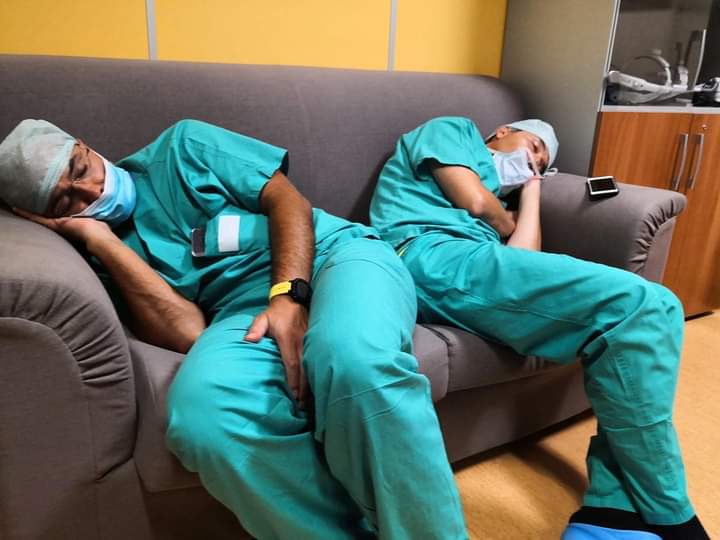 Sfiniti, dopo una intera notte ad operare, crollano su un divano di fortuna presente in un ufficio dell’ospedale. Loro sono due medici, giovanissimi, finiti immortalati da un collega che ha colto l’attimo, come si suol dire. I protagonisti sono Antonio Longobardi , cardiochirurgo, e Francesco Frunzo, anestesista, entrambi dipendenti dell’Azienda ospedaliero-Universitaria “San Giovanni di Dio e Ruggi d’Aragona” di Salerno che, seppur involontariamente, testimoniano il gioco di squadra, la passione per il lavoro, l’impegno e l’abnegazione in un momento, come quello che si sta vivendo a causa del Covid-19, che danno speranza. Il lavoro, serio, svolto in silenzio.