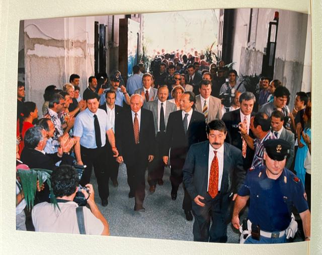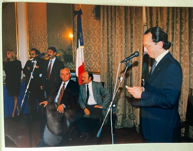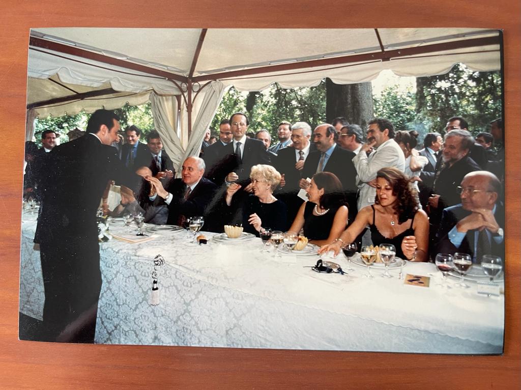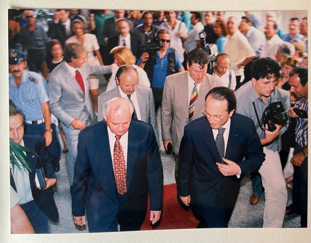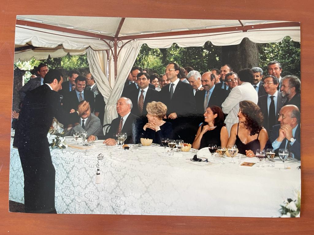 Ci spostammo, poi, a Castel Rovere di Giffoni Valle Piana, nella Villa Siniscalchi, dove la Provincia aveva organizzato un pranzo d’onore al quale partecipò anche la consorte di Gorbachev, Signora Raissa. E qui racconto altri due episodi particolari. Il primo: nel viale d’ingresso della tenuta l’illustre ospite fu accolto dai proprietari e dall’Onorevole Ciriaco De Mita, il primo Presidente del Consiglio dei Ministri che era stato in visita di Stato nella Russia della ‘perestrojka’. Naturalmente avevo invitato De Mita alcuni giorni prima. In pochi assistemmo alla bella scena dell’abbraccio tra i due, caloroso, sincero, come tra amici di antica data che si rivedono con piacere e commozione! Si appartarono per un bel po’ in conversazione riservata all’interno del palazzo. Il secondo: proprio De Mita aveva più volte raccontato in pubblico (lo ha ripetuto un paio di anni fa, intervistato da Marco Damilano davanti a un gruppo di allievi e docenti della nostra Università durante uno degli incontri di FILMIDEA curato dal Professore Pietro Cavallo) che i coniugi Gorbachev, amavano molto una canzone napoletana le cui note avevano scandito, il loro primo incontro: “Dicitencello vuje”. Chiesi perciò a Bruno Venturini di intervenire a conclusione del ricevimento per eseguire il brano con la sua bellissima voce e la suggestiva interpretazione. Fu un dono inatteso e, ancor più per questo, suscitò in loro una profonda emozione!