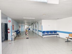 L’ospedale di Agropoli è una struttura praticamente vuota, una scatola che dovrebbe contenere servizi, ma così non è. Un viaggio fotografico all’interno di esso ben spiega la situazione: corridoi deserti, macchine nuove ma inutilizzate e porte chiuse che danno sul nulla.