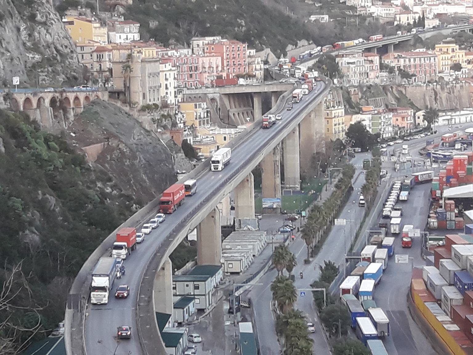Ci risiamo. Anno nuovo, traffico vecchio. La “maledizione” (se di maledizione si può parlare) del Viadotto e delle arterie limitrofe prosegue con conseguente traffico veicolare, in ingresso ed in uscita dalla città capoluogo. Questa volta a bloccare tutto sono stati due chiusini del Viadotto Gatto e una conseguente lesione sulla struttura, che da tempo ormai crea non pochi problemi. Il danno è localizzato a metà del tratto in discesa del Viadotto. Insomma, nel punto cruciale di passaggio (continuo, indisturbato e senza controllo) dei mezzi pensanti. E lo scenario è sempre lo stesso. Impianto semaforico, viabilità ridotta ad una corsia, appesantimento del traffico su tutte le altre arterie cittadine e provinciali, autostrada compresa. Una sola pattuglia dei vigili urbani presidia la buca, per il resto è assoluto caos. È solo l’ennesimo campa- nello d’allarme che l’ormai affaticata infrastruttura lancia a chi di dovere. Per ora, denunce e segnalazioni sono passate tutte inosservate. L’ultima preoccupante nota arrivata all’attenzione dell’amministrazione comunale risale alla fine di novembre. Uno dei condomini di via Ligea denunciava, infatti, «l’assoluta mancanza di regolamentazione del traffico che provoca, molto spesso, il contemporaneo transito sulle campate, nei due sensi di marcia, di veicoli incolonnati, che con i loro carichi di containers e bobine di acciaio (che talvolta sfiorano anche le 40 tonnellate) gravano in maniera concentrata e statica sul viadotto. Ad accrescere la situazione di pericolo va, anche, segnalato che a causa delle acque piovane (particolarmente copiose nel periodo invernale e non adeguatamente incanalate) si sta progressivamente deteriorando la struttura del viadotto, con ulteriore pregiudizio per il sottostante fab- bricato, che presenta evidenti lesioni». Ed ancora: «In particolare, sul viadotto, nel tratto che sovrasta l’edificio condominiale, vi è nella corsia di marcia a salire un riquadro di cemento presumibilmente a chiusura di un pozzetto di ispezione che a causa del passaggio quasi ininterrotto di automezzi pesanti provenienti dal porto risulta gravemente disconnesso ed avvallato con inevitabili ripercussioni sul fabbricato sia per il rumore avvertito a qualunque ora del giorno e della notte sia per le vibrazioni propagate. Tale avvallamento, in occasione delle piogge, assume la funzione di vero e proprio tombino, per cui buona parte delle acque meteoriche che scorrono copiose sulla sede stradale si riversa al suo interno, interessando tutte le strutture sottostanti e pre- giudicando la sicurezza del viadotto. La conseguente caduta di acqua, oltre ad interessare il fabbricato condominiale, si riversa in maniera concentrata anche su una porzione di montagnola posta sul lato occidentale, la cui natura franosa costituisce ulteriore fonte di pericolo per la pubblica incolumità potendo determinarsi l’improvviso distacco di materiale». Manco a dirlo, pochi mesi dopo il Viadotto ha mostrato ancora una volta tutta la sua pericolosità. L’argomento, nei mesi precedenti, era finito anche al centro di diverse sedute di commissione trasparenza ma allo stato nessuna relazione dell’intenso lavoro è stata prodotta. Sul doppio senso di circolazione lungo via Indipendenza e via Sabatini manco a parlarne, nonostante le diverse sollecitazioni che da anni giungono dagli automobilisti che da nord devo raggiungere il capoluogo. Ci provò tempo fa – forte di una raccolta di firme – l’allora sindaco di Vietri sul Mare, Alfonso Giannella che fu fermato, poi, dall’allora assessore alla viabilità (oggi primo cittadino di Baronissi), Gianfranco Valiante. Vietri sul Mare non riuscì neppure a spuntare il blocco del passaggio dei tir sull’ex Statale 18. Eppure qualche tempo prima su quell’arteria maledetta ci era scappato, purtroppo, anche il morto. Da allora nulla è cambiato. Anzi, è aumentato il traffico dei mezzi pesanti.