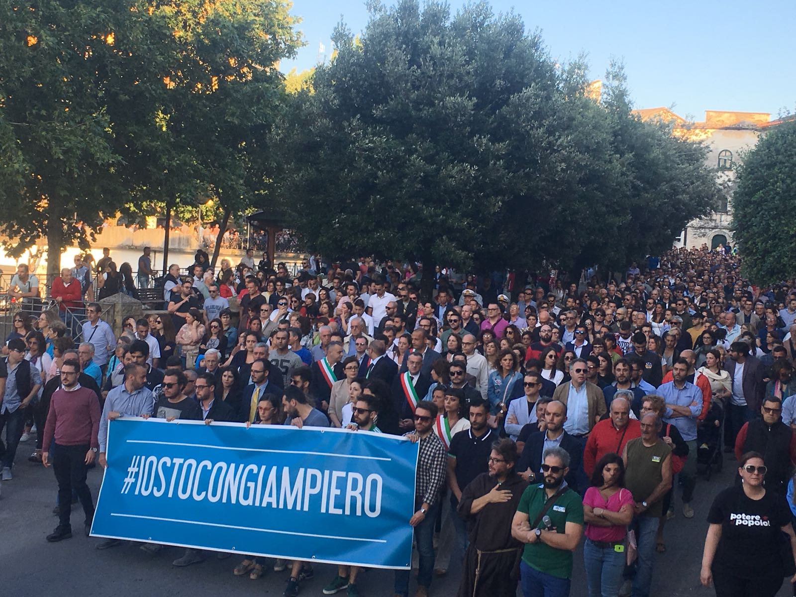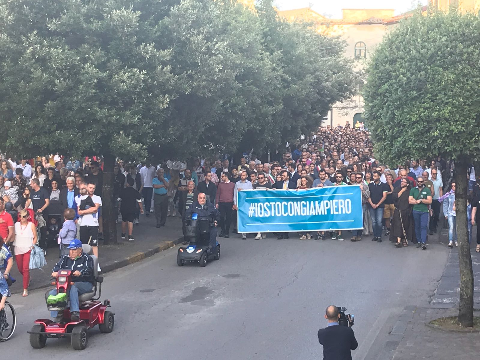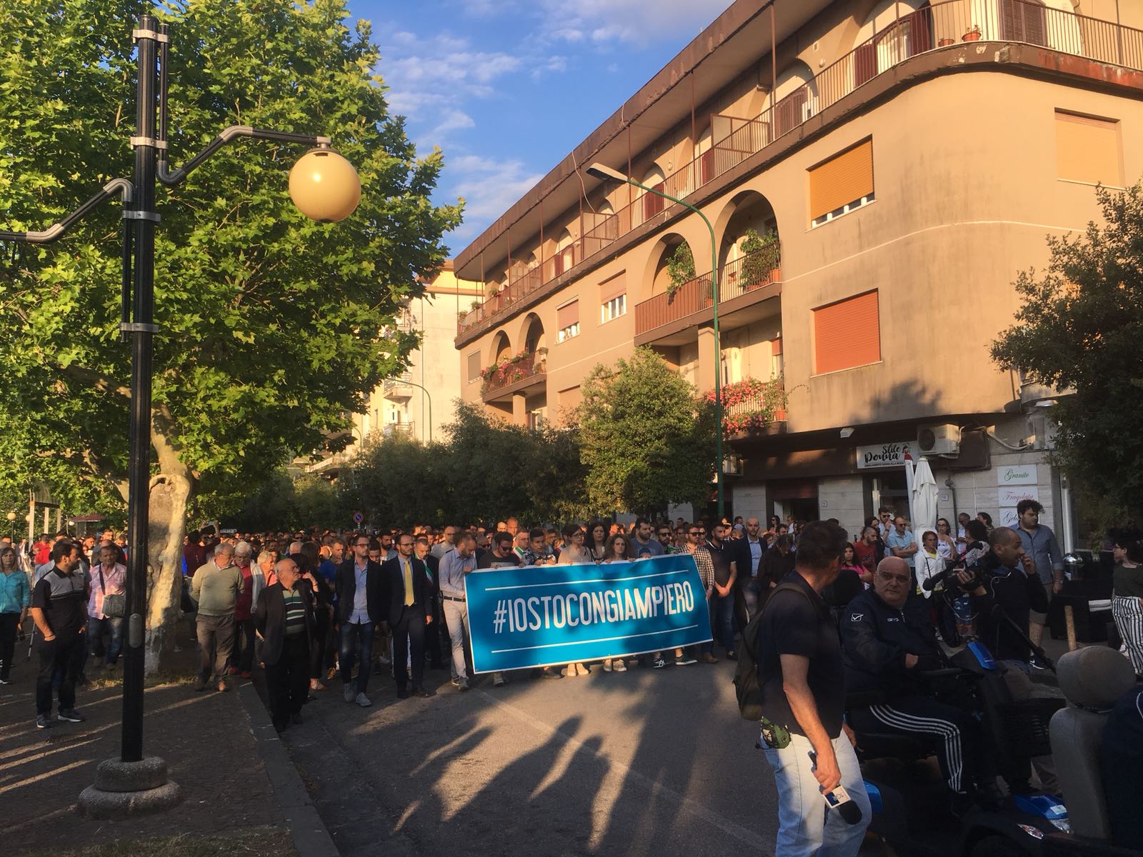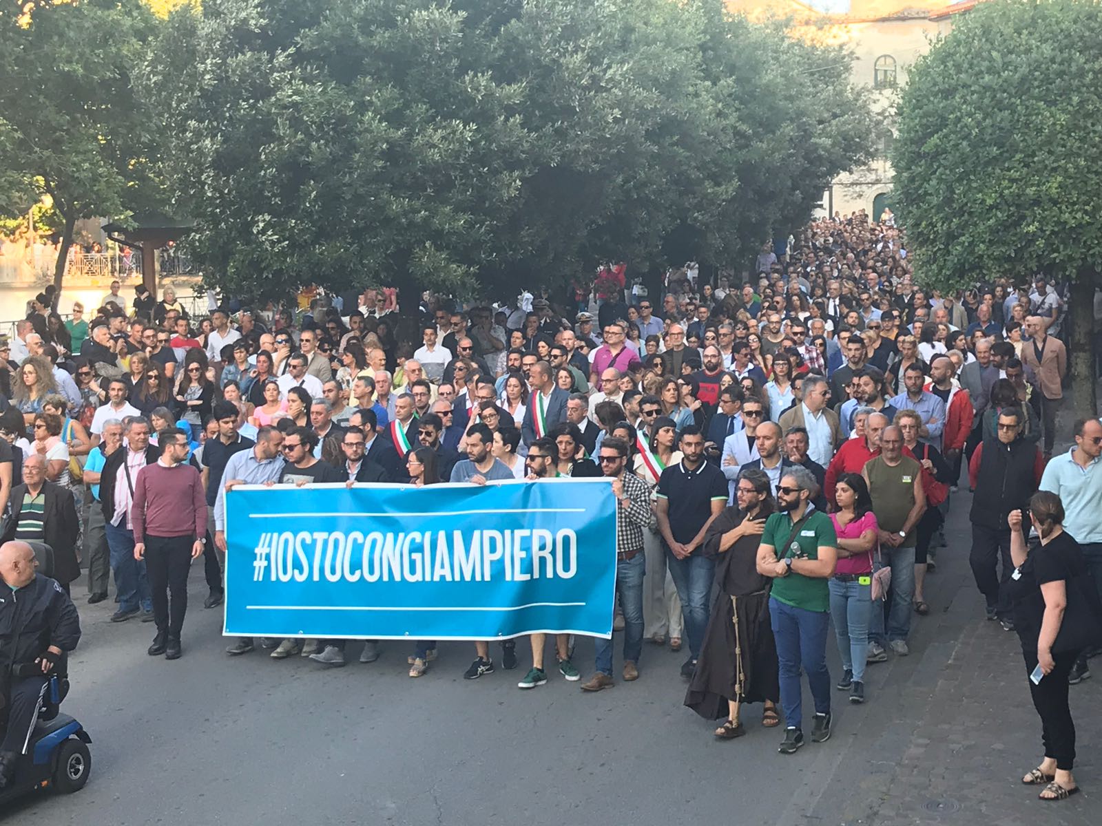 Un silenzio spettrale ha accompagnato le centinaia di persone che ieri hanno preso parte al corteo silenzioso contro l’inaudita violenza e ingiustizia subita dal giovane Giampiero Delli Bovi. Il corteo, organizzato dal Forum dei Giovani di Montecorvino Rovella, di cui Giampiero è presidente, ha visto la partecipazione di tantissimi montecorvinesi ma non solo. Presenti anche tantissimi colleghi del giovane avvocato, rappresentanti l’Ordine degli avvocati di Salerno e i vari Forum Provinciali dei Giovani. Le strade del paese gremite, per esprimere tutta la rabbia e l’indignazione di questi giorni. Quel pacco bomba infatti non ha soltanto devastato la vita di Giampiero, ma ha anche scosso l’intero paesino, sprigionando paure e timori. Tantissimi i giovani presenti, persone che conoscono Delli Bovi e non possono che elogiarlo per la sua gentilezza e disponibilità. “Ogni qualvolta lo incrociavo per strada e gli parlavo ero estasiata dal suo sorriso. Sorrideva con gli occhi, la sua bontà traspariva in ogni dove. Spero che adesso, nonostante tutto, riesca a sorridere, ancora”, afferma una ragazza singhiozzando. Tutti sono composti, ci si guarda intorno, la speranza si tocca con mano, è nell’aria prepotentemente. Giampiero ce la farà, non è solo. A squarciare il silenzio sono le parole commosse pronunciate da Padre Gianfranco: “Dico sempre anche in chiesa che la peggior bestemmia è il silenzio, oggi però questo silenzio è il silenzio di un cuore che batte all’unisono. La tentazione era quella di chiuderci invece siamo scesi per strada coraggiosi. E tutti voi siete bellissimi. Tutto questo è per Giampiero, Giampiero che ha bisogno di voi e che chiede di voi, di quello che il suo paese pensa. Oggi stiamo rompendo il terrore. Questo lungo applauso è per lui, preghiamo per Giampiero”. Il corteo è stato dunque un cammino spavaldo per dire no alla violenza, e farlo in silenzio con compostezza ed umiltà. Montecorvino per Giampiero, per spronarlo a lottare questa grande battaglia che dovrà affrontare. Montecorvino insieme a Giampiero per sconfiggere ogni sopruso e cattiveria, per un giovane ragazzo innocente che ha ancora tanti sogni da dover realizzare. A pochi minuti dall’inizio della marcia silenziosa, due giovani, in prossimità del convento, stanno parlando delle condizioni di Giampiero, ricoverato nel plesso di via San Leonardo del Ruggi D’Aragona. “Ora bisogna solo fare silenzio” è la risposta ferma di uno dei due giovani alla richiesta di un pensiero per Giampiero. Risposta quasi simile: “Magari dopo, ora no”, da parte di uno dei due ragazzi del Forum appoggiati alla ringhiera sul lato esterno di via Cavour. Tra i primi ad arrivare, a piedi, il sindaco di Giffoni Sei Casali, insieme all’ex sindaco Gerardo Marotta. Il neo sindaco di Montecorvino Rovella Martino D’Onofrio dialoga con due uomini dell’arma dei carabinieri. A piedi arriva anche il sindaco di Giffoni Valle Piana Antonio Giuliano, che si unisce al gruppo di altri primi cittadini dei Picentini, a cui si aggiungono il sindaco di Olevano sul Tusciano e di Bellizzi. Alle 19:20, con qualche minuto di ritardo, ha inizio il corteo, che procede lungo il viale esponendo alla testa uno striscione blu con su scritto #IostoconGiampiero. Il corteo con una foltissima partecipazione attraversa il viale che porta a piazza Belvedere, dove su invito di frate Gianfranco si osservano tre minuti di silenzio. Piazza Belvedere e l’area circostante è occupata da un’enorme follaDopo le parole di frate Gianfranco lo striscione con su scritto #IostoconGiampiero viene appeso alla ringhiera del primo piano del municipio. Tra le quasi duemila persone presenti, il sindaco di Bellizzi Mimmo Volpe; il presidente del Consiglio dell’ordine degli avvocati, Amerigo Montera con i legali in toga; i consiglieri comunali di Salerno Dante Santoro e Leonardo Gallo ed il neo parlamentare Nicola Acunzo, solo per citarne alcuni.