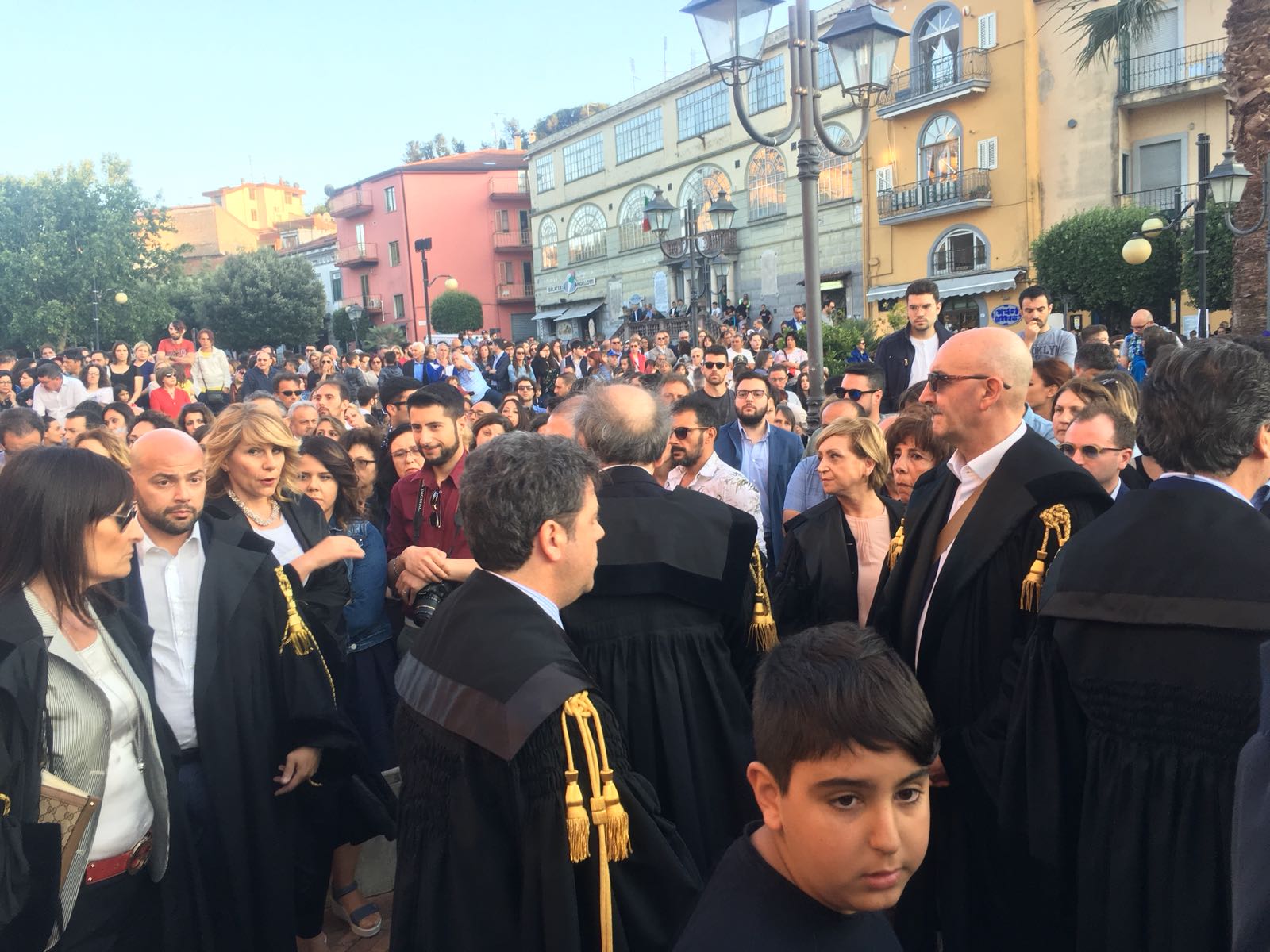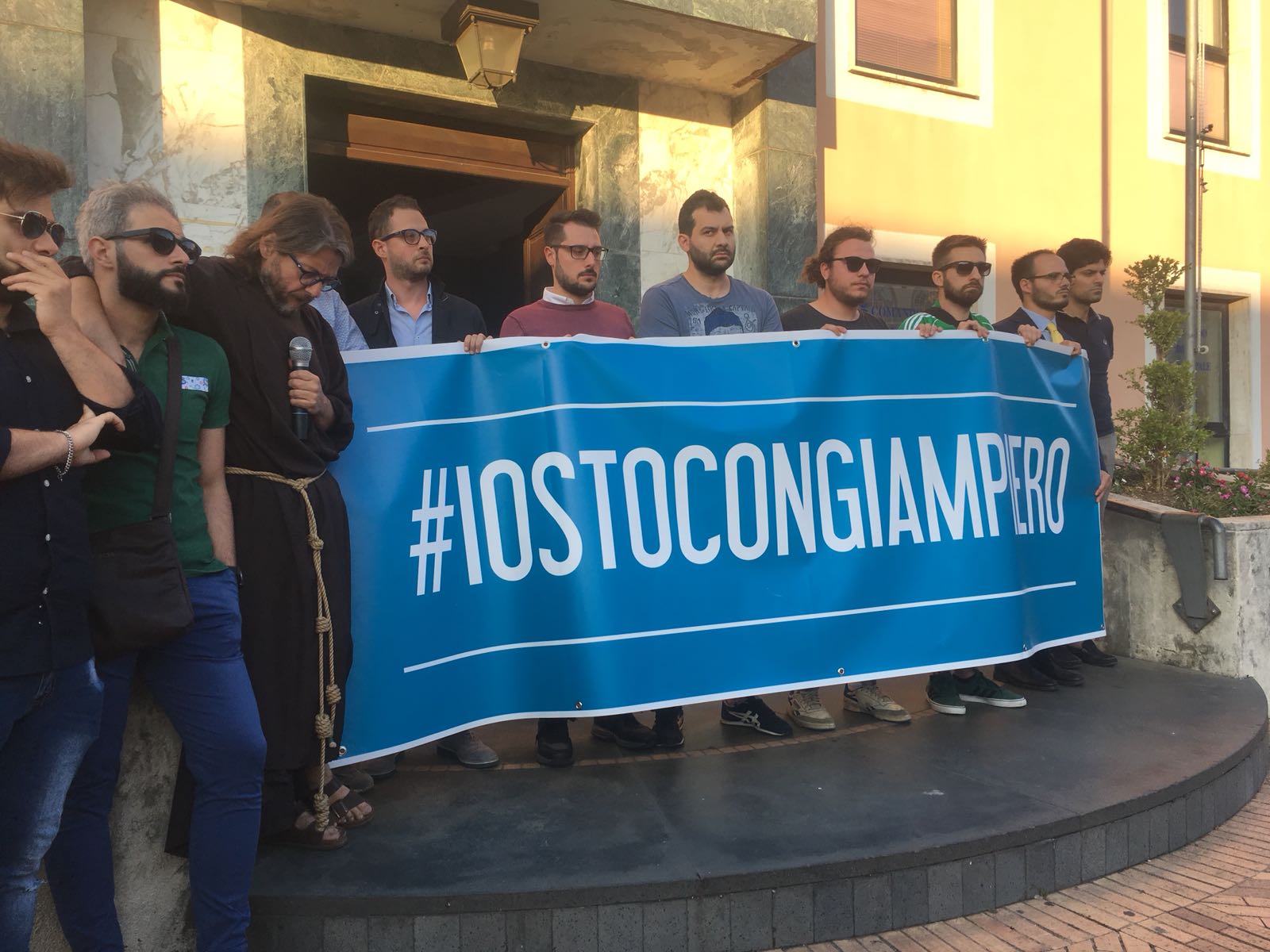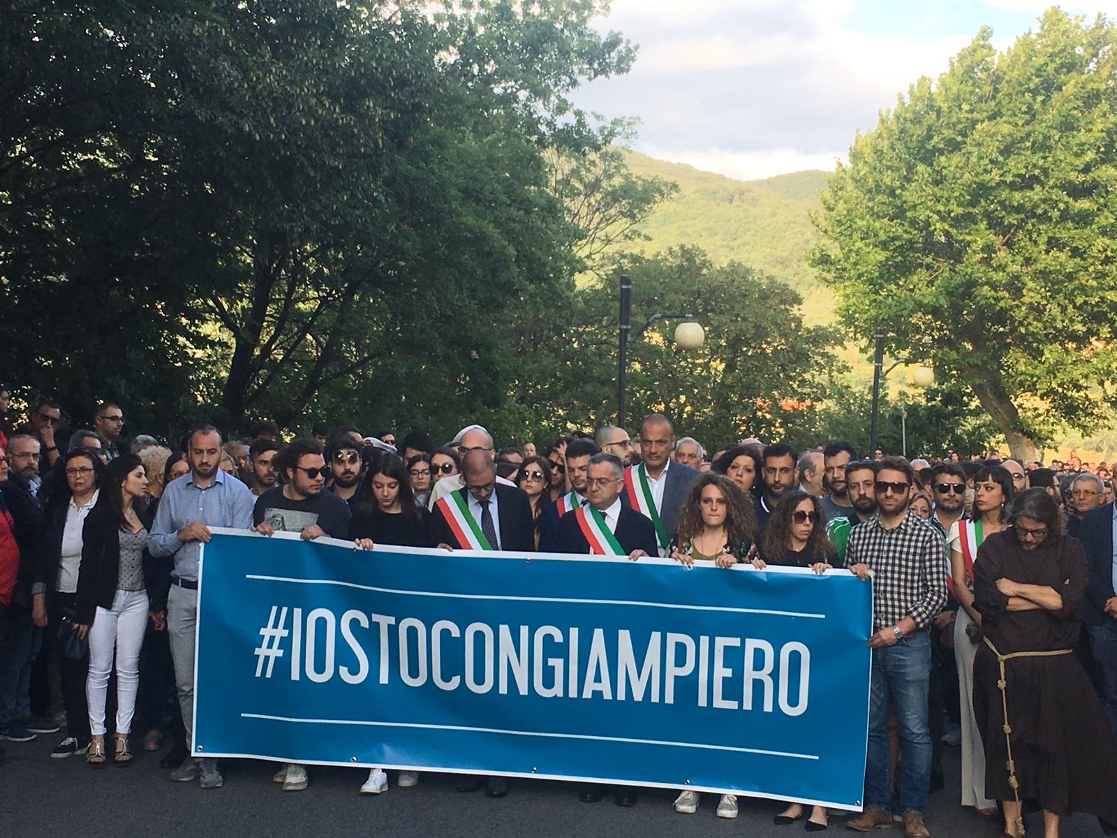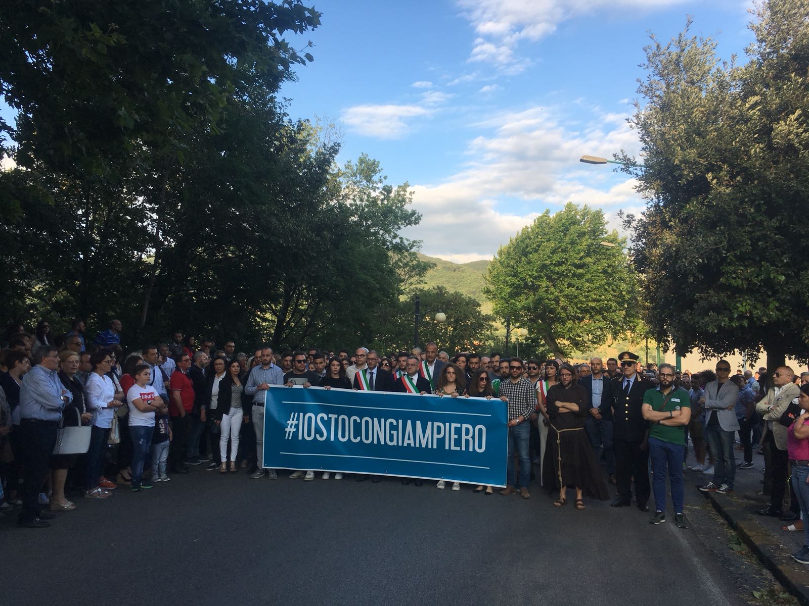 Un silenzio spettrale ha accompagnato le centinaia di persone che ieri hanno preso parte al corteo silenzioso contro l’inaudita violenza e ingiustizia subita dal giovane Giampiero Delli Bovi. Il corteo, organizzato dal Forum dei Giovani di Montecorvino Rovella, di cui Giampiero è presidente, ha visto la partecipazione di tantissimi montecorvinesi ma non solo. Presenti anche tantissimi colleghi del giovane avvocato, rappresentanti l’Ordine degli avvocati di Salerno e i vari Forum Provinciali dei Giovani. Le strade del paese gremite, per esprimere tutta la rabbia e l’indignazione di questi giorni. Quel pacco bomba infatti non ha soltanto devastato la vita di Giampiero, ma ha anche scosso l’intero paesino, sprigionando paure e timori. Tantissimi i giovani presenti, persone che conoscono Delli Bovi e non possono che elogiarlo per la sua gentilezza e disponibilità. “Ogni qualvolta lo incrociavo per strada e gli parlavo ero estasiata dal suo sorriso. Sorrideva con gli occhi, la sua bontà traspariva in ogni dove. Spero che adesso, nonostante tutto, riesca a sorridere, ancora”, afferma una ragazza singhiozzando. Tutti sono composti, ci si guarda intorno, la speranza si tocca con mano, è nell’aria prepotentemente. Giampiero ce la farà, non è solo. A squarciare il silenzio sono le parole commosse pronunciate da Padre Gianfranco: “Dico sempre anche in chiesa che la peggior bestemmia è il silenzio, oggi però questo silenzio è il silenzio di un cuore che batte all’unisono. La tentazione era quella di chiuderci invece siamo scesi per strada coraggiosi. E tutti voi siete bellissimi. Tutto questo è per Giampiero, Giampiero che ha bisogno di voi e che chiede di voi, di quello che il suo paese pensa. Oggi stiamo rompendo il terrore. Questo lungo applauso è per lui, preghiamo per Giampiero”. Il corteo è stato dunque un cammino spavaldo per dire no alla violenza, e farlo in silenzio con compostezza ed umiltà. Montecorvino per Giampiero, per spronarlo a lottare questa grande battaglia che dovrà affrontare. Montecorvino insieme a Giampiero per sconfiggere ogni sopruso e cattiveria, per un giovane ragazzo innocente che ha ancora tanti sogni da dover realizzare. A pochi minuti dall’inizio della marcia silenziosa, due giovani, in prossimità del convento, stanno parlando delle condizioni di Giampiero, ricoverato nel plesso di via San Leonardo del Ruggi D’Aragona. “Ora bisogna solo fare silenzio” è la risposta ferma di uno dei due giovani alla richiesta di un pensiero per Giampiero. Risposta quasi simile: “Magari dopo, ora no”, da parte di uno dei due ragazzi del Forum appoggiati alla ringhiera sul lato esterno di via Cavour. Tra i primi ad arrivare, a piedi, il sindaco di Giffoni Sei Casali, insieme all’ex sindaco Gerardo Marotta. Il neo sindaco di Montecorvino Rovella Martino D’Onofrio dialoga con due uomini dell’arma dei carabinieri. A piedi arriva anche il sindaco di Giffoni Valle Piana Antonio Giuliano, che si unisce al gruppo di altri primi cittadini dei Picentini, a cui si aggiungono il sindaco di Olevano sul Tusciano e di Bellizzi. Alle 19:20, con qualche minuto di ritardo, ha inizio il corteo, che procede lungo il viale esponendo alla testa uno striscione blu con su scritto #IostoconGiampiero. Il corteo con una foltissima partecipazione attraversa il viale che porta a piazza Belvedere, dove su invito di frate Gianfranco si osservano tre minuti di silenzio. Piazza Belvedere e l’area circostante è occupata da un’enorme follaDopo le parole di frate Gianfranco lo striscione con su scritto #IostoconGiampiero viene appeso alla ringhiera del primo piano del municipio. Tra le quasi duemila persone presenti, il sindaco di Bellizzi Mimmo Volpe; il presidente del Consiglio dell’ordine degli avvocati, Amerigo Montera con i legali in toga; i consiglieri comunali di Salerno Dante Santoro e Leonardo Gallo ed il neo parlamentare Nicola Acunzo, solo per citarne alcuni.