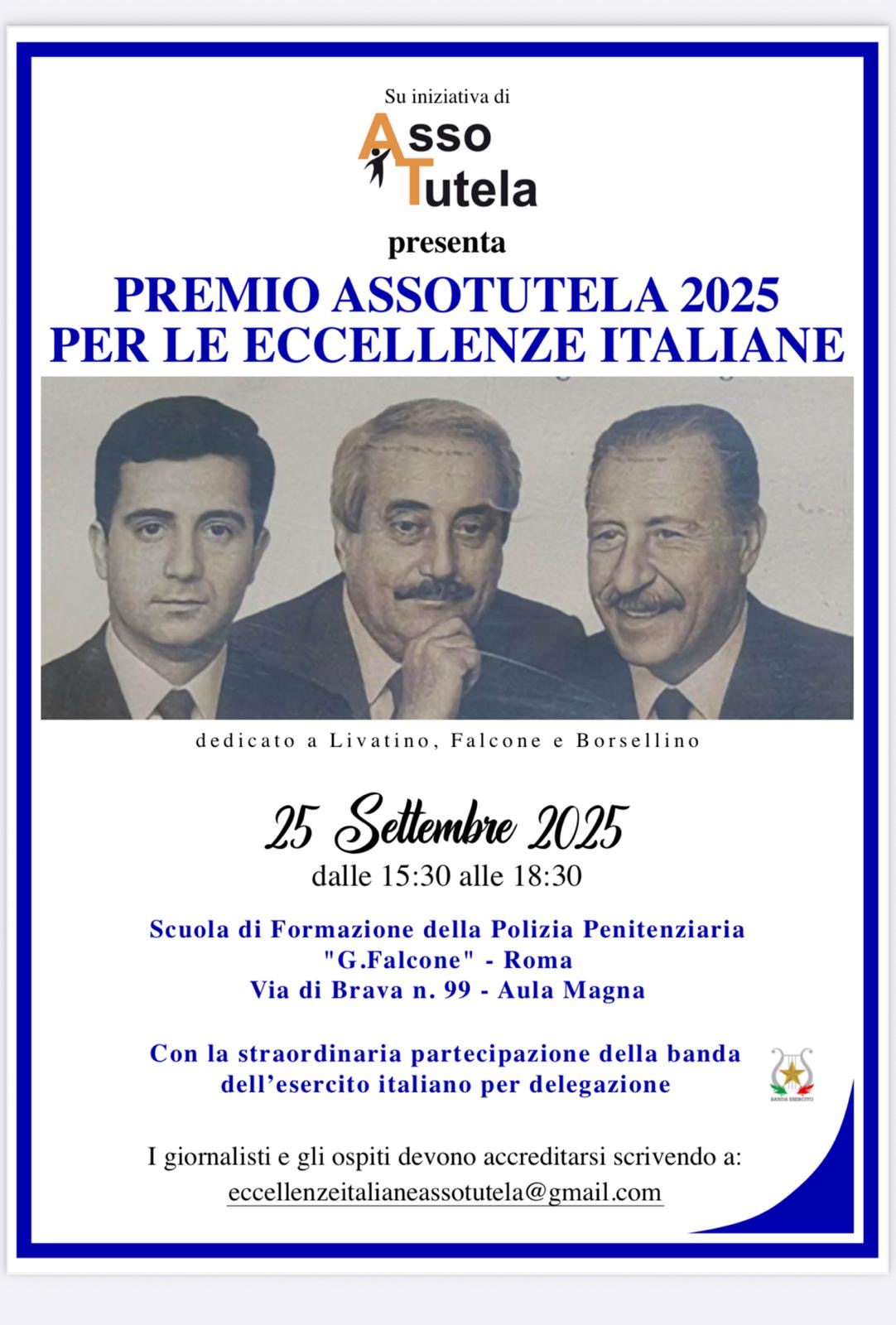 Giunge alla sua 18ª edizione il Premio Eccellenze Italiane Assotutela, appuntamento di prestigio che celebra personalità, istituzioni e realtà distintesi per coraggio, dedizione e spirito di servizio alla collettività.La cerimonia si terrà il 25 settembre 2025 dalle ore 15:30 alle 18:30, presso la Scuola di Formazione della Polizia Penitenziaria “G. Falcone” – Roma, Via di Brava n. 99 – Aula Magna. L’evento sarà aperto dalla banda musicale dell’Esercito Italiano, in un momento solenne dedicato alla memoria e alla legalità. Il premio, intitolato ai giudici Rosario Livatino, Giovanni Falcone e Paolo Borsellino, vittime del dovere e simboli indelebili di giustizia, si avvale quest’anno di tre padrini d’eccezione: l’on. Stefania Pezzopane, l’on. Rachele Mussolini e il magistrato Valerio de Gioia.