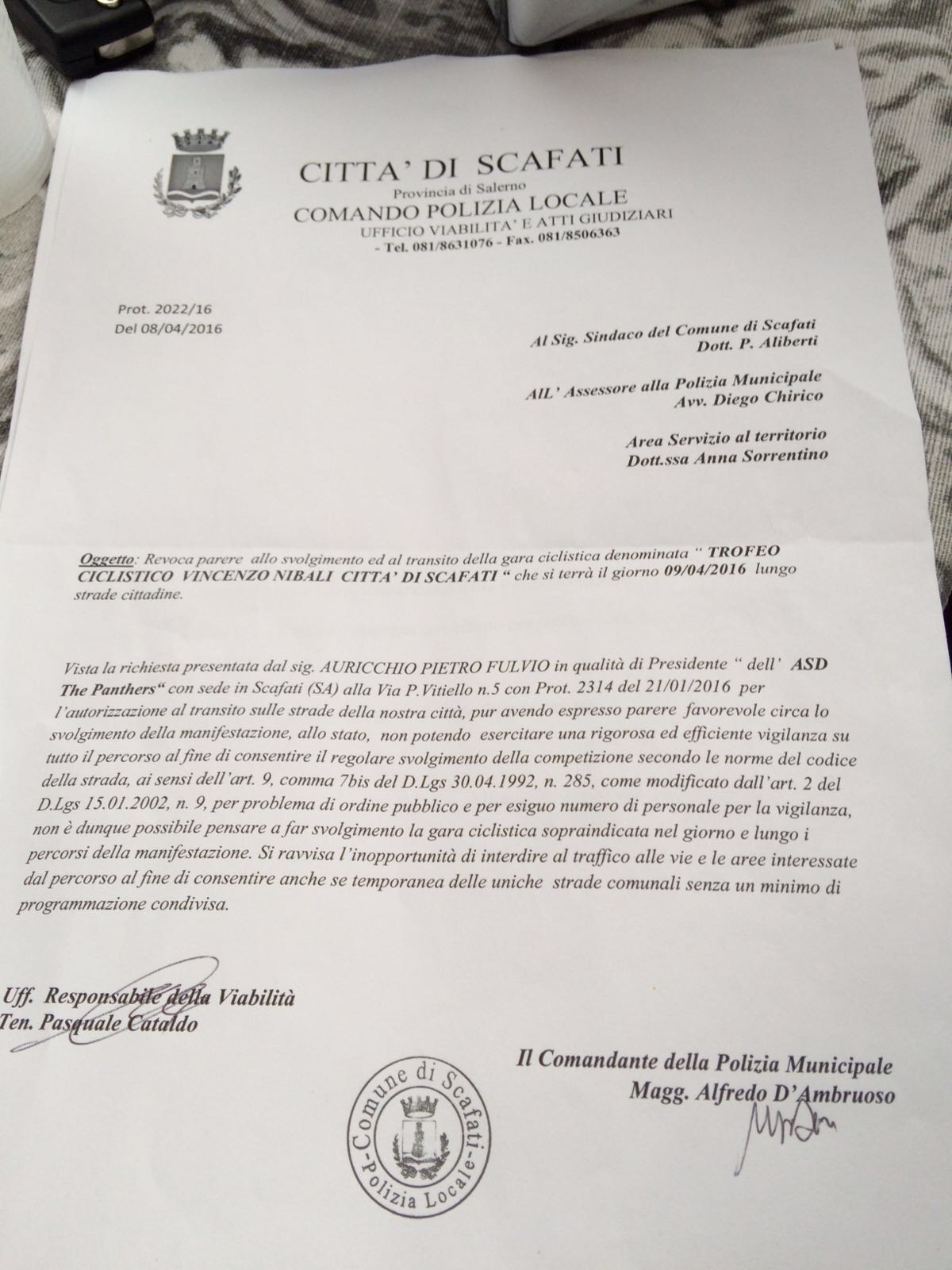 1-revoca permesso Ed è stato in questo momento che il comandante ha prima rassegnato le dimissioni (prot. PM 2021) e poi revocato i permessi (prot. 2022). Aliberti però sceglie la strada breve, a nega ogni protocollo, forse confidando nel fatto che questo non è stato ratificato in Comune. Una cosa è negare le dimissioni, un’altra non averle ufficializzate. Doveroso precisarlo, e a tale proposito pubblichiamo la lettera. Anche Chirico porge le scuse agli organizzatori, assumendosi ogni responsabilità, poi lancia pesanti stoccate all’indirizzo di D’Ambruoso, seppur senza mai nominarlo direttamente. “Ingenuamente e stupidamente ho creduto di potermi fidare di un settore e di uomini che attraverso un confronto quotidiano, da più di un mese aveva portato avanti l’organizzazione della manifestazione con cambio di data, orario e percorso, con pareri favorevoli, ordinanze di chiusure e la disputa della gara in orario di servizio – spiega Chirico – è l’esempio che la parola data, oltre che le autorizzazioni scritte – per qualcuno non ha valore”. Che il comandante D’Albruoso ultimamente sia sotto stress, a seguito delle verifiche della Dia e della commissione d’accesso su atti da lui prodotti, era voce note, ma l’assessore allo sport sembra quasi voler confermare: “con tutto il rispetto delle questioni umane e personali, ritengo che chi ricopra un ruolo istituzionale o una carica apicale abbia il dovere di svolgerlo la con la giusta serenità, altrimenti sarebbe opportuno farsi da parte”. E nel mentre resta da capire l’efficacia della lettera di dimissioni, giura di portare la vicenda in commissione garanzia il piddino Marco Cucurachi: “La notizia dell’annullamento della gara ad un giorno dall’evento desta stupore e preoccupazione per lo sperpero di denaro pubblico e di risorse umane (l’evento era patrocinato anche dal Comune di Scafati, ndr) anche in relazione alle presunte dimissioni del comandante D’Ambruoso e alle pesantissime dichiarazioni dell’assesore Diego Chirico – spiega il presidente della commisisone – i permessi e le autorizzazioni esistevano o no? La disponibilità dei dipendenti all’espletamento del servizio, c’era o no?”. Una vicenda che ha tanti lati oscuri da chiarire, non da smentire.