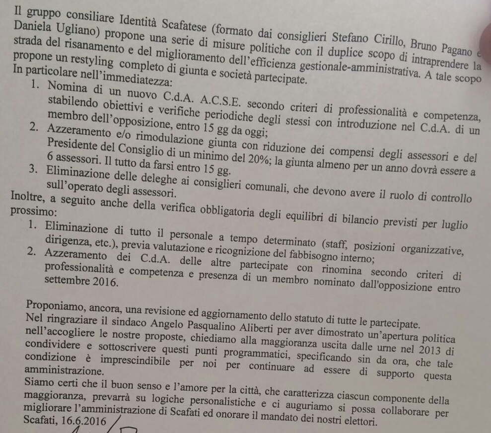 “Abbiamo firmato un documento assieme al sindaco, ma sono mancate le firme degli altri consiglieri di maggioranza. Per questo motivo noi lasciamo l’aula”. E cosi salta l’accordo con Identità Scafatese, dopo quello che è stato il pomeriggio più lungo dell’amministrazione Aliberti. Tutto comincia intorno l’ora di pranzo, quando Giancarlo Fele, vice sindaco facente funzioni, azzera le deleghe agli assessori. È il primo atto dell’accordo, dopo l’azzeramento del CDA Acse e delle deleghe ai consiglieri comunali. Resta da sottoscrivere un accordo, decisamente articolato e variegato. Si punta non solo al contenimento della spesa, ma anche il “potere” in capo al primo cittadino viene ridimensionato. È chiaro che la firma a quell’accordo consegna alla città un Aliberti ridimensionato. Ad ogni modo, il sindaco accetta tutto, rinnegando se stesso e rivendendo molte sue posizioni espresse in passato, come riconoscere alla minoranza un componente nei CDA delle partecipate. Sembrava fatta, poi il netto rifiuto di Brigida Marra e Diego Del Regno fanno saltare il banco. Occorre il piano B, quell’ inciucio che tanto non piace alla città, e che Aliberti ha provato ad evitare. L’alternativa è il commissariamento. “Hanno preferito l’incucio alle nostre proposte – fa sapere Stefano Cirillo – Forse gli altri componenti della maggioranza sono troppo attaccati a vecchie logiche e preferiscono gli inciuci piuttosto che trattare con chi è stato eletto con loro nel 2013”.