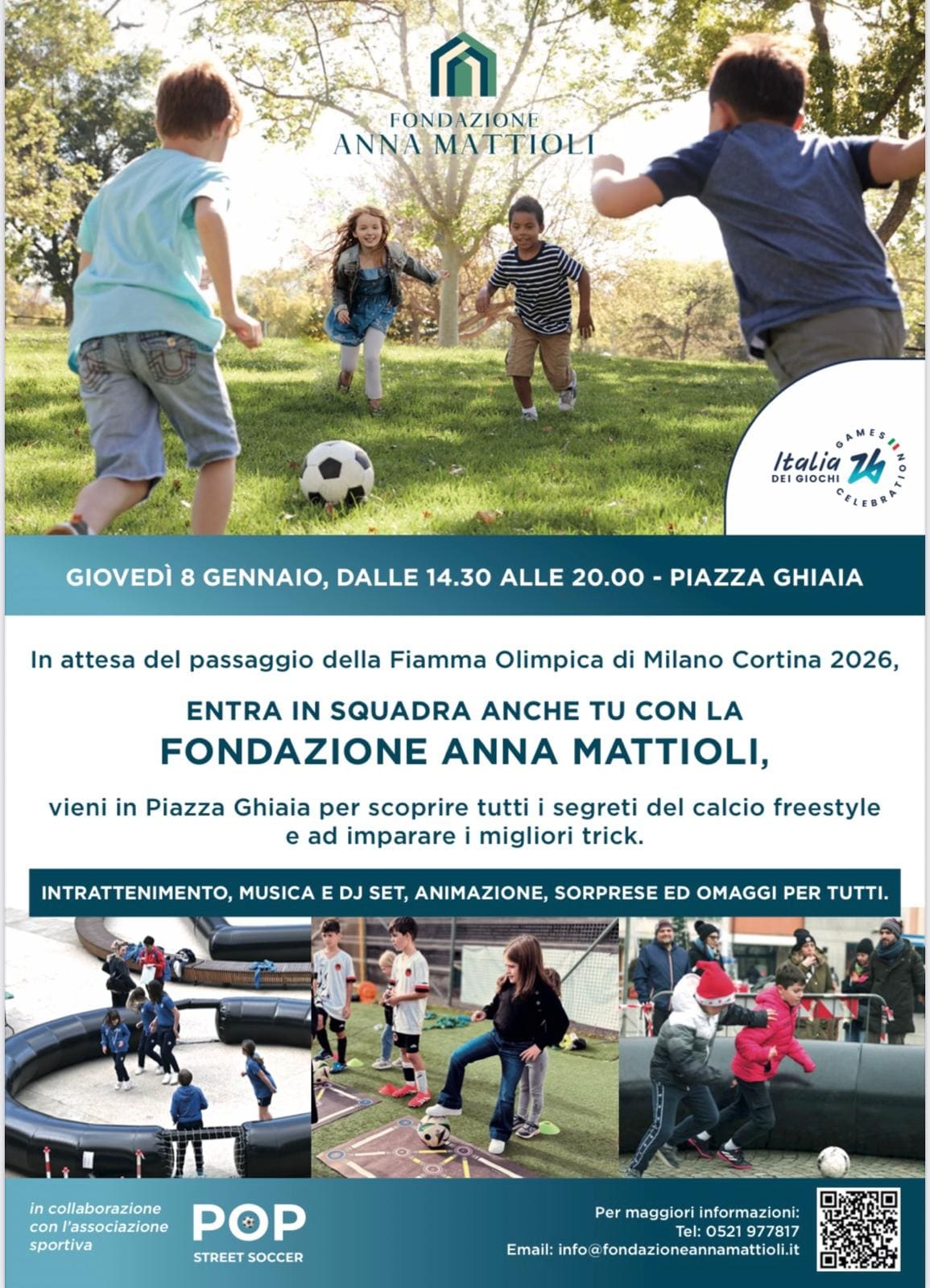 Nel solco dei Valori Olimpici e Paralimpici, come sostenibilità, inclusività e fair play, la Fondazione Anna Mattioli porta lo “street soccer” a Parma, aspettando la Fiamma Olimpica di Milano Cortina 2026, di cui il Presidente Roberto Pagliuca sarà tedoforo d’eccezione. La Fondazione Anna Mattioli, infatti, ha da tempo lanciato la campagna “Entra in squadra anche tu”, che prevede un evento a Parma l’8 gennaio prossimo, dalle ore 14.30 alle 20.00 Per l’occasione, Piazza Ghiaia diventerà uno spazio dedicato ai giovani e allo sport, in concomitanza con il passaggio della staffetta della Fiamma Olimpica di Milano Cortina 2026, previsto nel cuore della città. “Attraverso il programma “Allenàti per Vincere” – afferma Pagliuca – prosegue il nostro impegno nella tutela dei minori anche mediante l’attività sportiva, invitandoli insieme a famiglie, scuole e associazioni del territorio a prendere parte a un evento aperto ed inclusivo”. In collaborazione con l’Associazione Sportiva Dilettantesca POP Street Soccer, la giornata offrirà ai bambini e ai ragazzi un’esperienza educativa e coinvolgente, con esibizioni di freestyle football, sfide uno contro uno, momenti di animazione, intrattenimento musicale con DJ set e numerose attività pensate per valorizzare lo sport come strumento di crescita e socializzazione.