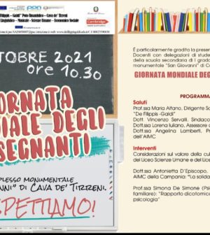 A Cava de’ Tirreni presso il liceo “De Filippis-Galdi” si terrà la Giornata mondiale degli insegnanti, organizzata in collaborazione con l’Associazione Italiana Maestri Cattolici “Giovani insegnanti: il futuro della professione”. E’ questo il tema della giornata mondiale degli insegnanti 2021. Giornata istituita dall’Unesco il 5 ottobre del 1994 per una riflessione sul ruolo dei professionisti della formazione, sulle sfide che affrontano quotidianamente, sulle difficili condizioni di lavoro a cui sono sottoposti. Ma anche una giornata che vuole commemorarele organizzazioni di insegnanti in tutto il mondo. Il suo obiettivo è quello di mobilitare il sostegno agli insegnanti e di garantire che i bisogni delle future generazioni continuino ad essere soddisfatte dai docenti. In molti Paesi del mondo saranno organizzati eventi per richiamare l’attenzione su una figura chiave nella crescita delle nuove generazioni. A un anno e mezzo dall’inizio della pandemia di COVID-19, la Giornata mondiale degli insegnanti 2021 sottolineerà il supporto che deve essere fornito agli insegnanti per partecipare pienamente al processo di recupero. Anche Cava de’ Tirreni, come detto, sarà presente con un incontro, organizzato dal Liceo “De Filippis Galdi”, e quindi martedì 5 ottobre, alle ore 10,30, presso la sala riunioni del complesso monumentale di “San Giovanni” si terrà l’incontro al quale parteciperanno tra gli altri la Dirigente scolastica del Liceo “De Filippis-Galdi”, Maria Alfano, ed ancora il sindaco di Cava de’ Tirreni, Vincenzo Servalli, e poi l’Assessore all’Istruzione, Lorena Iuliano, e la Presidente provinciale dell’AIMC, Angelina Lamberti, che porteranno i loro saluti ai presenti. Subito dopo seguiranno gli interventi della Presidente Regionale dell’AIMC, Antonietta D’Episcopo, su “La solidarietà magistrale” e Di Simona De Simone, Psicologa e Mediatore familiare, su “Rapporto dicotomico tra insegnamento e psicologia”. Poi sarà la volta degli studenti delle classi del Liceo delle Scienze Umane e del Liceo Economico-sociale che, guidati dalle Professoresse Carmela Di Nino, Grazia Gentile, Daniela Paolillo e Antonella Sellitti, si cimenteranno nella lettura degli articoli 33 e 34 della Costituzione italiana ed in performances teatrali per esprimere riflessioni sul valore della cultura scolastica. “Ora che anche l’Agenda 2030, approvata dalle Nazioni Unite, annovera l’Istruzione di qualità tra i 17 obiettivi – dichiara la Preside Maria Alfano – garantire una istruzione di qualità inclusiva ed equa e promuovere opportunità di apprendimento continuo per tutti è una sfida che gli insegnanti accolgono con forte determinazione ma anche con la consapevolezza che tutta la società civile è chiamata al dovere di educare le giovani generazioni.”