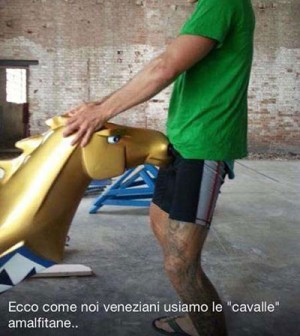 La vigilia della 60esima edizione del Palio remiero delle Antiche Repubbliche Marinare che si svolge a Venezia è stata macchiata da un gesto di pessimo gusto che non fa onore all’equipaggio di casa. Uno degli otto vogatori della Serenissima, si è fatto fotografare con le proprie parti basse in corrispondenza della polena di Amalfi rappresentata dal cavallo alato. Il tutto postato, con orgoglio, su Facebook, con tanto di didascalia con riferimento alle donne d’Amalfi.