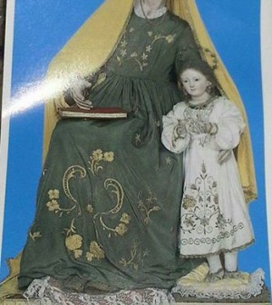 Questa è la madonnina che si trovava ai piedi della statua di S.Anna che è stata rubata nella chiesa di San Michele, lasciando sul posto solo la coroncina del capo della statuetta piccola ,questo vestito fu fatto a mano. la chiesa e mantenuta aperta da un gruppo di volotarie senza scopo di lucro anzi in autogestione se qualcuno ne avesse notizie