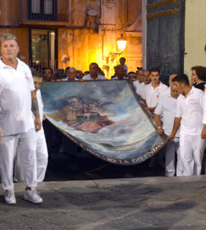 W S. Matteo. Si è conclusa con questa scritta che si è accesa di rosso grazie a fuochi d’artificio e a cinque minuti di spettacolo pirotecnico dal tetto della Cattedrale, l’alzata del Panno di San Matteo, che segna l’inizio del mese di preghiera e festeggiamenti in onore del Santo Patrono e che si concluderanno, come di consuetudine, il 21 settembre con la processione dell’Apostolo ed Evangelista e degli altri Santi, per le principali vie del centro cittadino. La giornata dedicata all’alzata del panno ha avuto inizio alle ore 19, quando nella Cripta della Cattedrale, dove si trovano le spoglie dei Martiri Salernitani, Ante, Gaio e Fortunato e la reliquia di San Matteo, don Michele Pecoraro, ha officiato la Santa Messa, alla presenza di tutti i portatori dei sei Santi, del vice sindaco Eva Avossa, dei consiglieri Roberto Celano e Donato Pessolano e numerosissimi cittadini. Nel corso dell’omelia don Michele ha ricordato la figura di San Matteo e l’incontro che questi fece con Gesù. Ha parlato della figura di San Matteo, prima come esattore delle tasse e poi come discepolo di Cristo…. “Sto pregando, in questi giorni, – ha detto Don Michele – San Matteo affinché conservi la città di Salerno nell’unità dell’anima e dello spirito. Tra Salerno e San Matteo c’è un rapporto d’amore viscerale, ma è un rapporto che non è sempre è fondato sulla fede, bensì sulla tradizione. Ecco dobbiamo imparare a capire che se non si segue la fede, se non si segue la parola di Gesù questo rapporto è destinato a finire”. Al termine della Santa Messa, la breve processione che ha visto il parroco della Cattedrale salernitana scortato dai portatori di San Giuseppe, San Gregorio, Sant’Ante, San Gaio e San Fortunato portare dalla Cripta al quadriportico del Duomo il “Braccio di San Matteo” che custodisce le reliquie del Santo, dietro di lui i portatori di San Matteo con il panno che raffigura l’immagine dell’apostolo con in braccio un angelo mentre benedice la città di Salerno. A chiudere la processione la banda Musikè di Pellezzano diretta dal professor Giuseppe Genovese. L’ingresso nel quadriportico della Cattedrale del “Braccio” e del “Panno” sono stati accolti da un lungo e intenso applauso, poi il rito dell’alzata del panno da parte dei portatori della paranza di San Matteo, a seguire un nuovo saluto alla cittadinanza da parte di Don Michele Pecoraro, la lettura del Vangelo ed ancora la benedizione mediate l’incenso del “Braccio” e del “Panno” da parte dell’Arcivescovo Metropolita della Diocesi di Salerno, Campagna e Acerno, il quale subito dopo ha rivolto il suo personale saluto alle autorità, alla cittadinanza e ai portatori. L’Arcivescovo ha concluso il suo intervento ricordando anche alcuni degli appuntamenti legati a questo mese di preghiera e festeggiamenti in onore di San Matteo. Appuntamenti che si terranno in diverse parrocchie della città da Mariconda a Pastena, da Ogliara a Torrione. Primo fra tutti però l’appuntamento alle ore 18 il giorno 30 agosto con la Santa Messa in Cripta in onore dei tre Santi Martiri Salernitani Ante, Gaio e Fortunato. Il finale, come detto, tra gli applausi, è stato tutto pirotecnico.