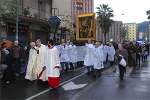 Quattro giorni per celebrare la Madonna di Pompei a Salerno. Le avverse condizioni meteorologiche non hanno scoraggiato i tanti devoti che hanno voluto rendere omaggio alla Venerata Immagine della Madonna del Rosario proveniente dalla città vesuvianae che rimarrà presso la Chiesa di San Giuseppe Lavoratore fino a domenica, periodo nel quale verrà articolatp un lungo programma liturgico per la missione mariana. L’immagine della Madonna è giunta a Salerno nel pomeriggio di ieri, scortata dal 19° reggimento Guide, per esser poi trasferita, intorno alle ore 16, presso la cittadella giudiziaria, nei pressi del “Faro della giustizia”, luogo dal quale ha preso il via la processione, alla quale hanno preso parte, nonostante il clima freddo e la pioggia battente, numerosi fedeli, che hanno scortato la venerata icona fino alla Chiesa di San Giuseppe Lavoratore. All’interno della parocchia, a partire dalle ore 18 e 30, le celebrazioni sono continuate con la recita del santo Rosario. Dopo la celebrazione della Santa Messa i fedeli si sono trattenuti fino a notte fonde con una veglia ed un incontro di catechesi sul Beato Bartolo Longo e il Santuario di Pompei, fino alla Compieta “Buonanotte a Maria”. Le celebrazioni riprenderanno questa mattina a partire dalle ore 8 con la celebrazione della Santa Messa, il “Buongiorno a Maria” e la recita delle lodi. Dalle ore 8,30 fino alle 11 all’interno della Parocchia si svolgeranno le confessioni in chiesa e la vista agli ammalati.