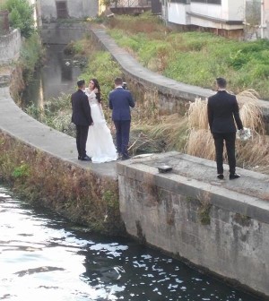 Giovedi pomeriggio, c’è un capannello di persone accalcato sul ponte in Piazza Vittorio Veneto, intento a scrutare sotto, il fiume Sarno. Qualcuno da un auto chiede cosa sia successo, la risposta: “Niente, c’è una sposa nel fiume”. L’uomo preoccupato scende e corre alla balaustra. La sposa effettivamente c’è, con sposo e fotografo, ma per fare foto per il book matrimoniale. A scattare foto e rendere virale la curiosa e pericolosa scena Marco Esposito. “Quando sono arrivato erano fermi li e stavano parlando, non so di chi sia stata l’idea. Guardavano giù ed io pensavo che guardavano qualcosa poi ho visto un ragazzo scavalcare e mi sono affacciato ho pensato che fosse caduto qualcosa, invece dopo hanno preso la sposa in braccio e l’hanno fatta scavalcare e dopo sono scesi i due fotografi”. Una manovra azzardata, decisamente rischiosa viste le dimensioni del muretto ma soprattutto pericolosa, perché da un lato scorre impetuoso il fiume, dall’altro invece lo stagno paludoso dei canali Fienga e Bottaro. Praticamente un tocco di salute, ma la puzza nelle foto non viene, e grazie ai software di fotoritocco è semplice far diventare limpide e cristalline il fiume Sarno. “Sono stati lì un 15/20 minuti, hanno fatto un po’ di foto. Ovviamente sul ponte si é fatta confusione tra invitati e passanti creando problemi al traffico perché dalle macchine cercavano di capire cosa stesse succedendo” ricorda ancora Esposito. Le foto, finite sul web, hanno acceso l’ilarità degli scafatesi, dividendoli in chi apprezza e chi ammonisce i temerari sposini. “È come andare a fare foto nella terra dei fuochi vicino ad un incendio di sostanze cancerogene, da evitare assolutamente” così Domenico, mentre secondo Anna: “Qualcuno ha trovato qualcosa di bello in questi scatti, forse Scafati è bella per qualcuno, non ci buttiamo sempre giù”.